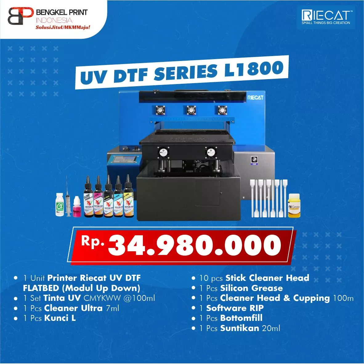 Bengkel Print Indonesia baru saja Launching Mesin Printer Riecat UV DTF A3 2022. Dengan adanya Paket Usaha Printer UV PH L1800 No Laminasi ini, di prediksikan akan menjadi FAVORITE BP Fams yang ingin mencoba bisnis cetak merchandise custom diberbagai media. Berbeda dari printer UV Flatbed seri sebelumnya, mesin UV DTF Flatbed terbaru 2022 ini mempunyai fitur & performa mesin yang cukup handal. Disamping itu kemampuannya dalam mencetak 2 metode yaitu : UV dan DTF , semakin membuat printer UV DTF ini multifungsi. Adapun fitur mesin UV DTF riecat A3 berserta spesifikasinya berikut dibawah ini !